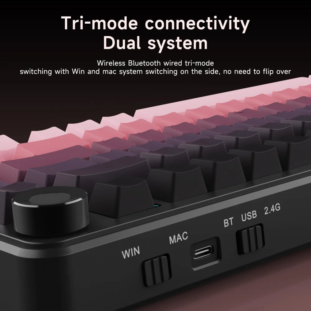 İstənilən vəziyyətdə – ev, ofis, oyun üçün – USB-C, 2.4 GHz və Bluetooth 5.0 obyektiv keçid təmin edir. Ergonomik ABS korpus və elastik FR4 plate ilə yumuşaq, dəqiq və sakit yazış təcrübəsi təqdim edilir. Hot-swappable PCB ilə switch dəyişdirmək heç bir alət tələb etmir; Sea Salt və Flying Fish switch variantları fərqli yazı hissləri verir. 8000 mAh batareyasına malik klaviatura, uzun müddətli istifadəyə dözümlüdür. South-facing RGB və 16 canlı işıq effekti, hətta musiqiyə reaksiya verən audio perception ilə stil və funksionallığı bir arada təqdim edir. Ayarlanabilir ayaq dayağı və anti-slip rezin sayəsində rahatlıq artır. Windows, Mac və Android sistemlərində NKRO dəstəyi ilə tam uyğunluq qurulur.Sual: „Triple-mode bağlantı nədir?“