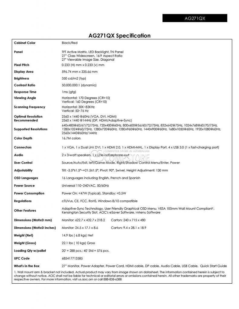AOC Agon AG271QX 27-inch Gaming Monitor Bakıda ucuz qiymətə almaq üçün CompStore İnternet-maqazini müraciət edin.