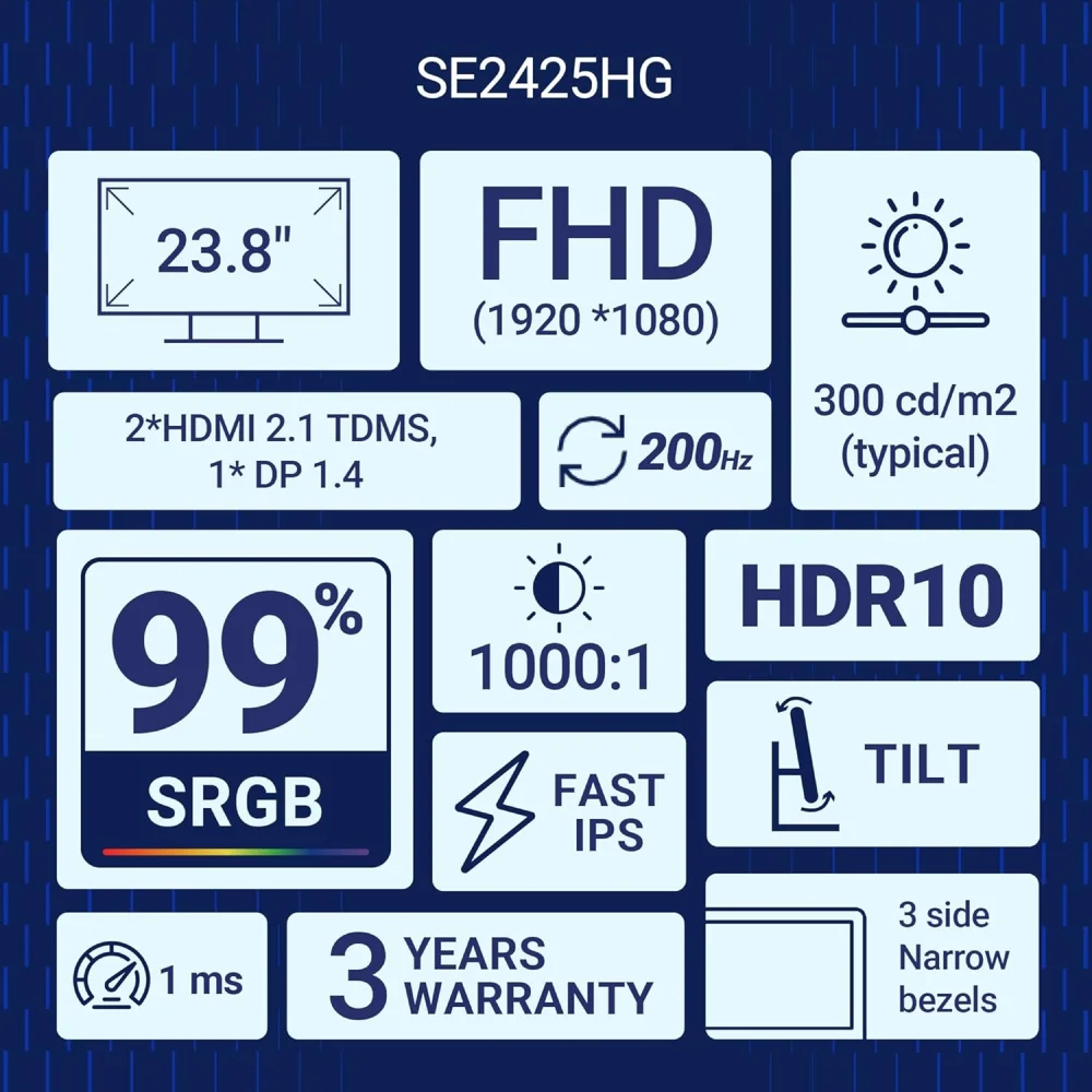Dell SE2425HG – oyunçular üçün hazırlanmış 24 düymlük 200Hz Gaming Monitor modelidir. Bu ekran sürətli yeniləmə dərəcəsi, kəskin görüntü və aşağı gecikmə (low input lag) ilə sizə rəqiblərinizə qarşı üstünlük qazandırır. Dell brendinin etibarlılığı və texnoloji təkmilliyi bu modeldə öz əksini tapır.